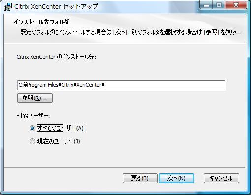 3. XenCenterのインストールパスと実行する対象ユーザを選択し[次へ]を