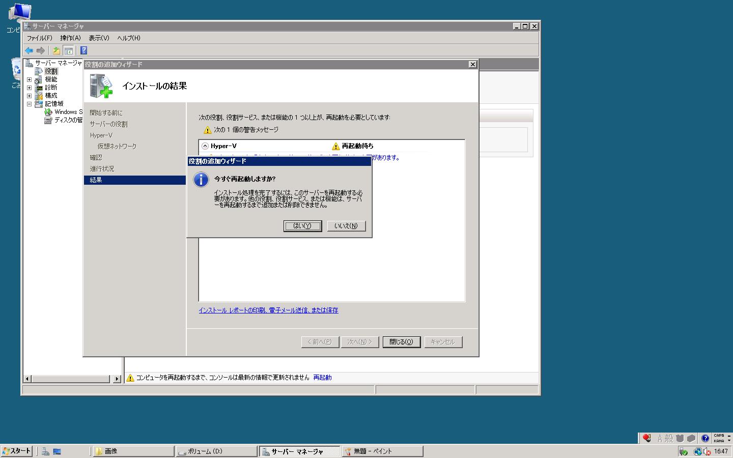 8.『Hyper-V』のインストールが完了したら↓の画面になり、